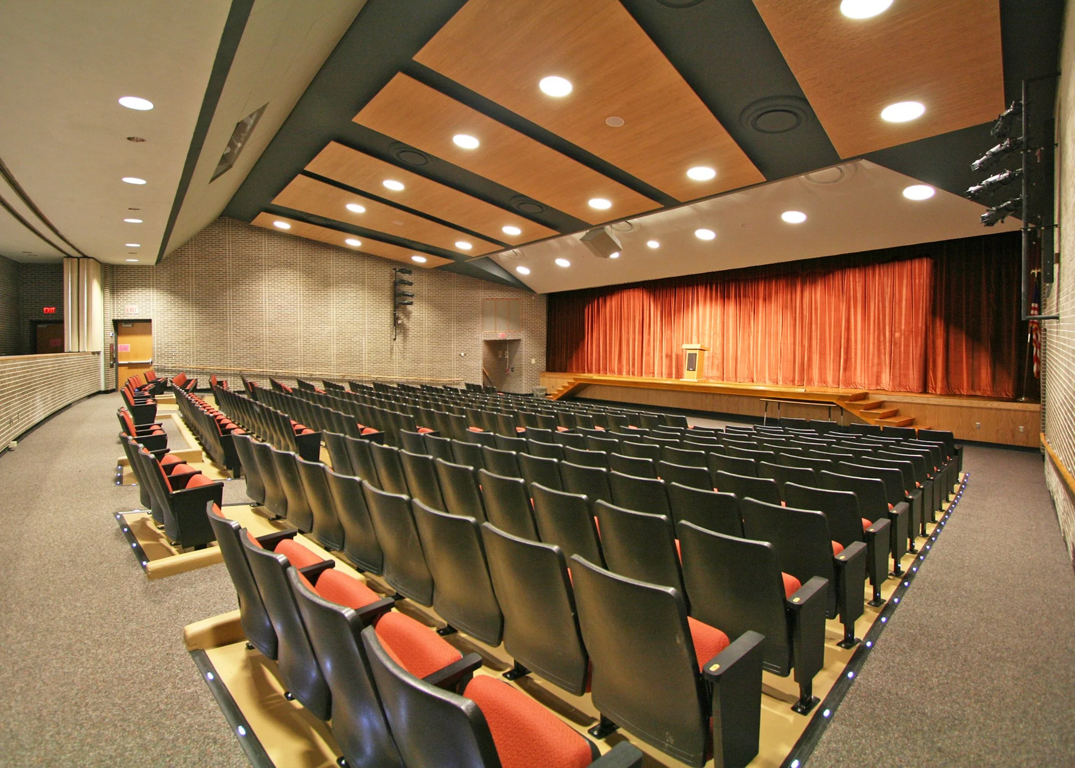 The design for renovations to the Unami Middle School Auditorium included new seating, wood ceiling panels, stage curtain and backdrop, acoustical panels, and flooring finishes. The area was updated to meet ADA accessibility standards.