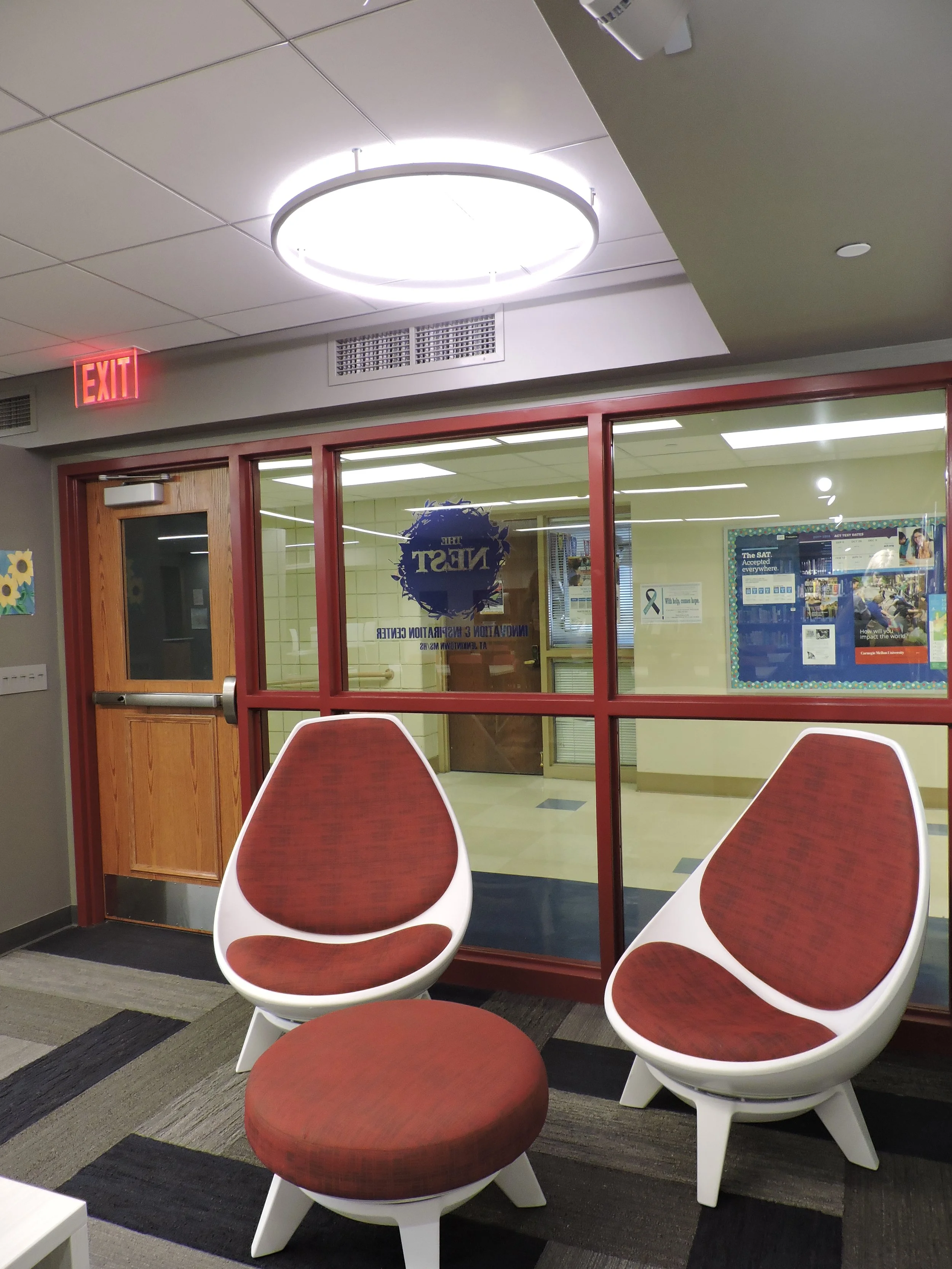Jenkintown School District asked GKO to create a Media Center and Maker Space from existing Library Space. The Library was redesigned to accommodate a contemporary Media Center; with increased technology, and more flexibility for alternate spaces. The existing library did not receive natural light. Therefore, there were opportunities to create views to the exterior across corridors.